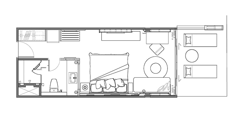Hop right into our lagoon pool from your private terrace. Our Lagoon Pool Access Deluxe Terrace is situated by Karon beachfront, with glass sliding doors opening onto your private sundeck furnished with comfortable sun loungers, offering the perfect blend of indoor and outdoor living aspects for a beach vacation.