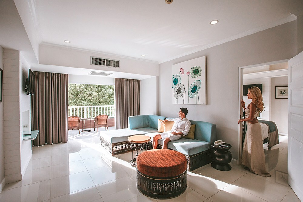 Stylishly decorated with a contemporary Thai design, our two-bedroom Phuket suite offers ample space to accommodate large groups and families traveling together. Our large rooms range from 96 to 113 square meters, offering spacious and comfortable living areas, two bedrooms with ensuite baths, and private terraces for a five-star tropical resort experience.