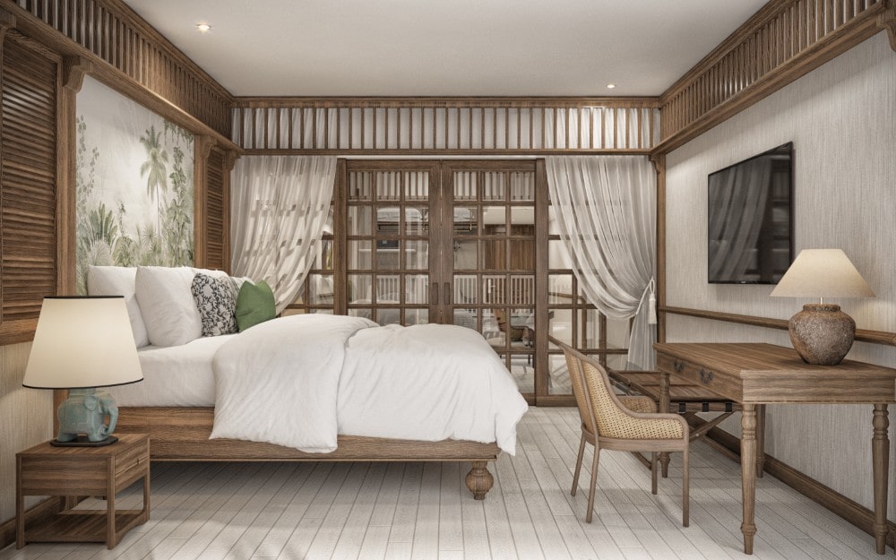This spacious accommodation features furnishings made of rattan, wood, and contemporary lines that create an airy atmosphere under a warm natural wood tone. The large suite includes two bedrooms with en-suite bathrooms, a living area, and a private balcony that offers refreshing views of the tropical garden. It is perfect for family stays or larger groups traveling together. Enjoy luxurious amenities thoughtfully selected to provide you with the utmost relaxation and comfort.